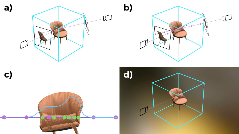 Steps of the query process. In a) the volume is constructed by tracing rays from each camera into the scene. Then samples are placed along with the rays in b), and based on the density at each sampling point, additional samples are placed in c). The samples are then evaluated into a BRDF, which is re-rendered using the jointly optimized illumination in d).