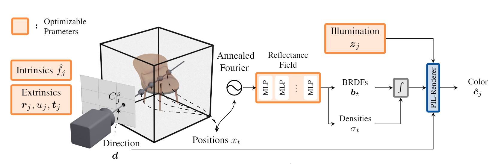 In FIGURE 1 we visualize the SAMURAI architecture, which jointly optimizes the camera extrinsic and intrinsic parameters per image, the global shape and BRDF, as well as the per-image illumination latent variables. Here, we leverage Neural-PIL for the rendering and prior on natural illuminations.